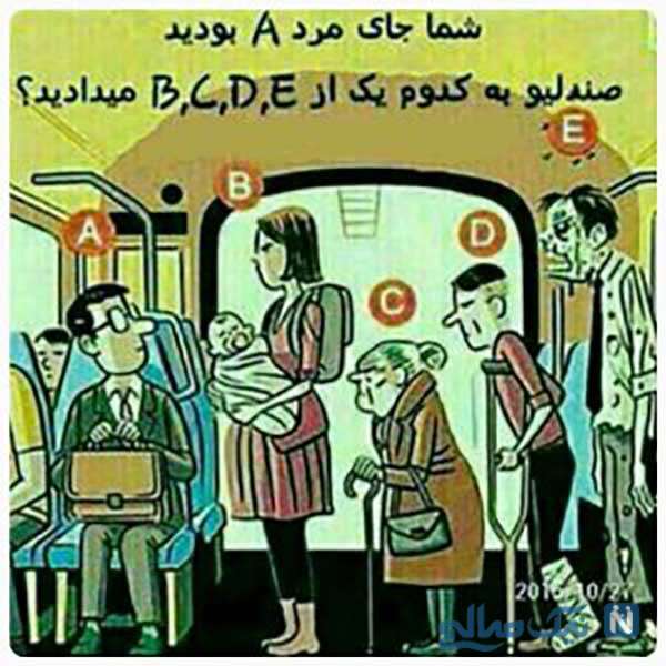این تست شخصیت شناسی فوق العاده را از دست ندهید! اگر شما جای شخصیت A بودید صندلی خود را به کدام یک از افراد زیر می دادید ؟ آشنایی با معروفترین تستهای شخصیت شناسی و کاربرد آنها